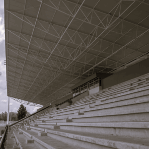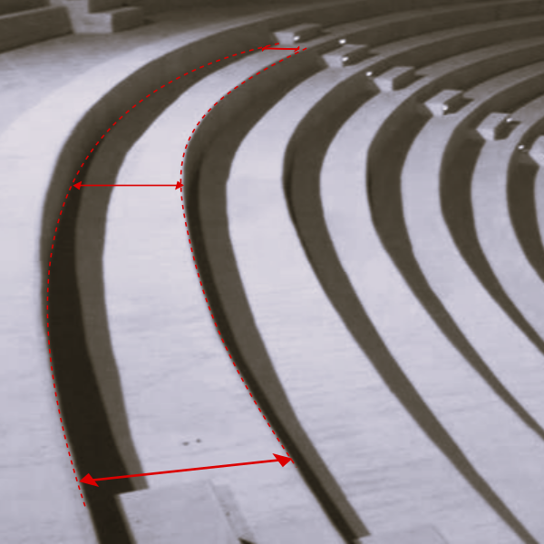 In the construction of curved grandstands, it is common for builders to deviate from concentric layouts due to structural or design constraints. This non-concentric configuration often results in variable row spacing—typically narrower at the lateral edges and wider toward the center. Such variation can impact both accessibility and seating ergonomics.